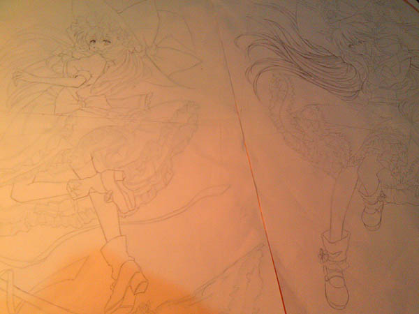 水張りして1日経ったカンバスにこれを貼って表から0.3のシャーペンで丁寧になぞってカンバスに絵をうつします。