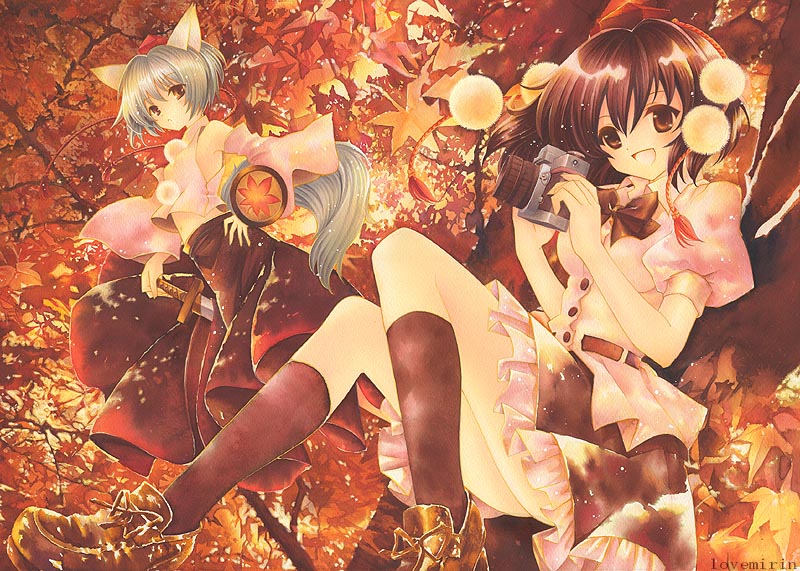 紅葉をバックに射命丸と犬走さんです。