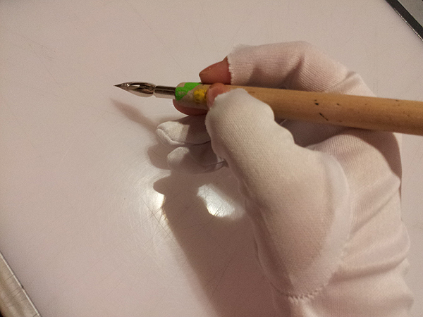 線の入りや抜きを爪楊枝で削ってとんがらせたりもします。
